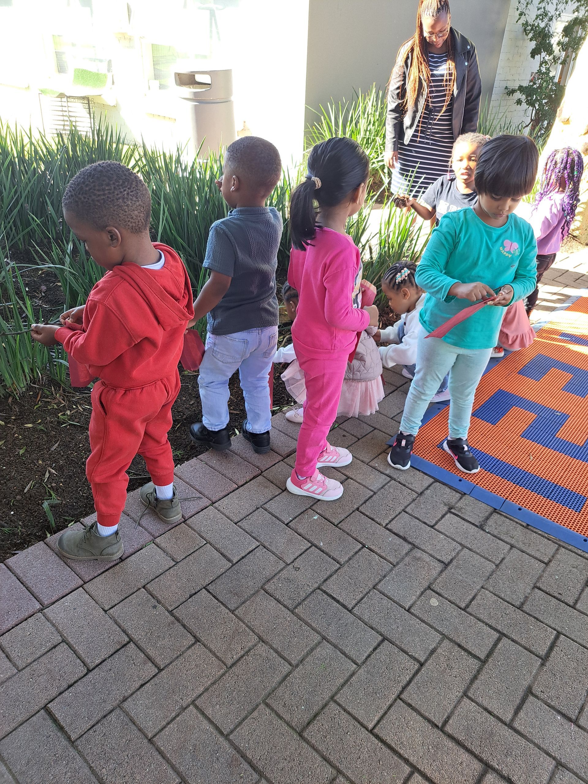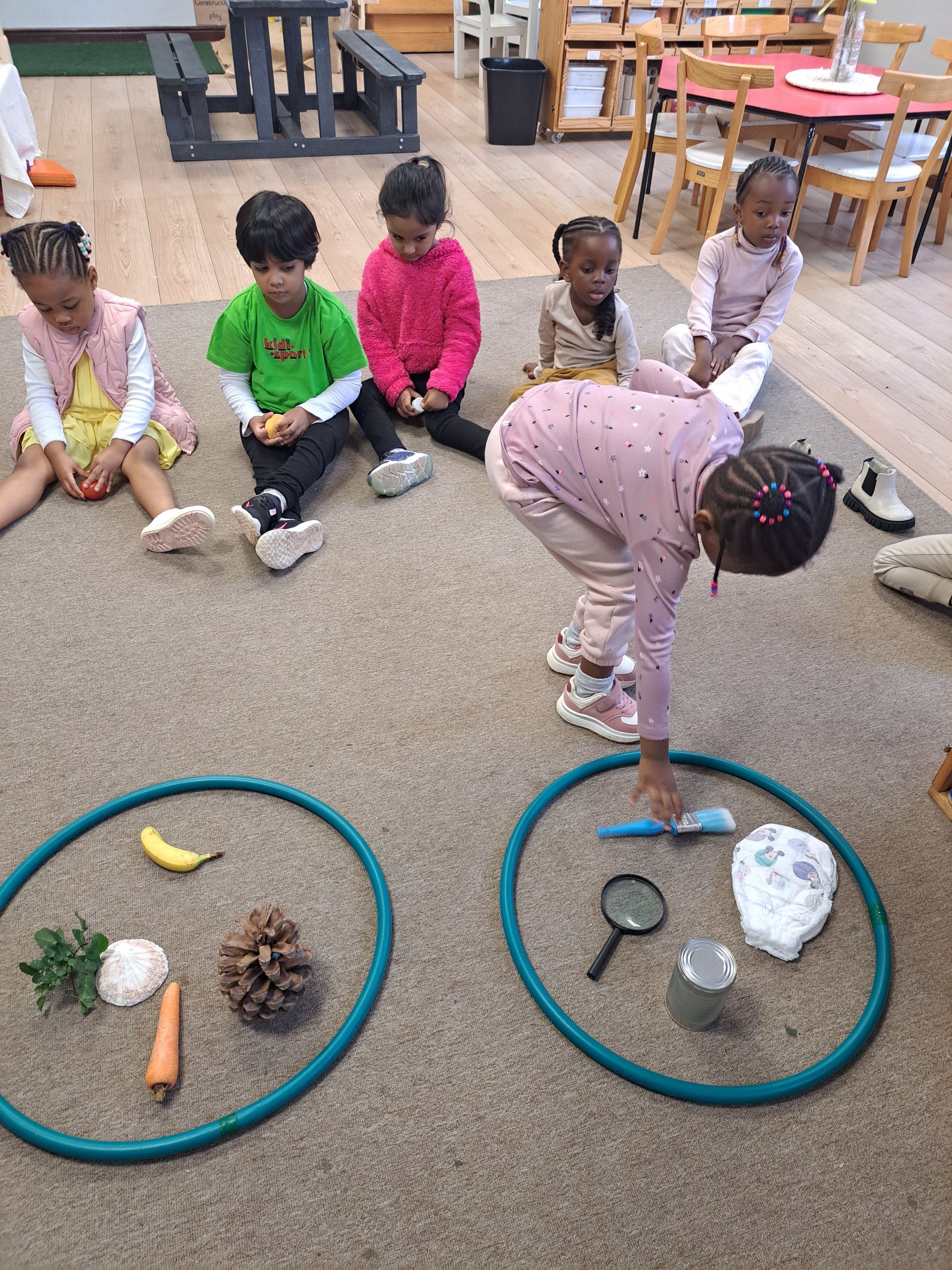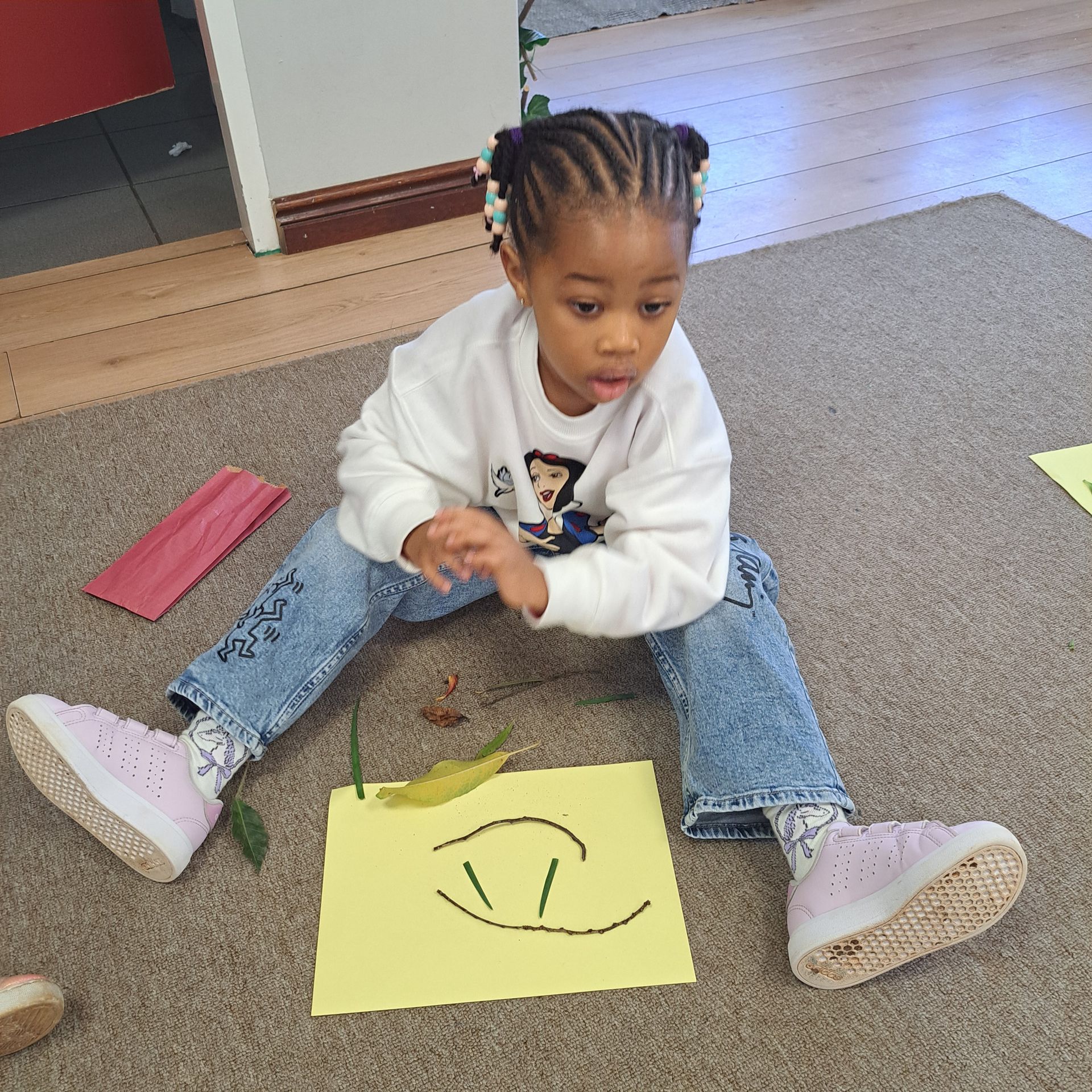 In Grade 000, our focus is on how nature helps us express creativity. Students explored the difference between natural and man-made objects by sorting them into two groups. The lesson continued with a nature walk where students collected materials to create a picture, reinforcing their connection to the environment.