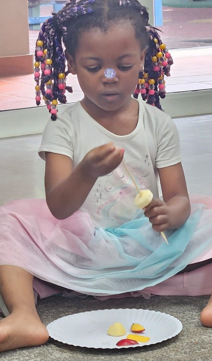 As part of our inquiry into healthy habits in our Grade 000 learning environments, our curious thinkers explored what healthy food looks like, feels like, and tastes like using a variety of fruits and vegetables. Through hands-on investigation, they became knowledgeable about making balanced choices and used their fine motor skills to carefully thread their own fruit sticks.