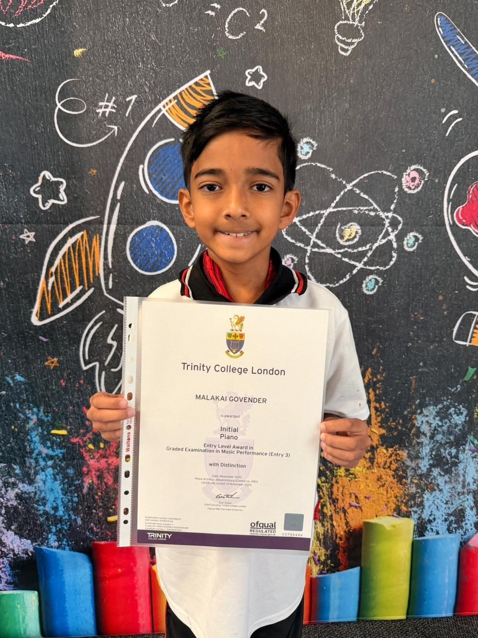 Well, done to Malakai Govender on receiving his Trinity piano exam certificate from Trinity College London, and a special shout out to Ashton Lu for his excellent chess results, Ashton received a medal and a very cool trophy.